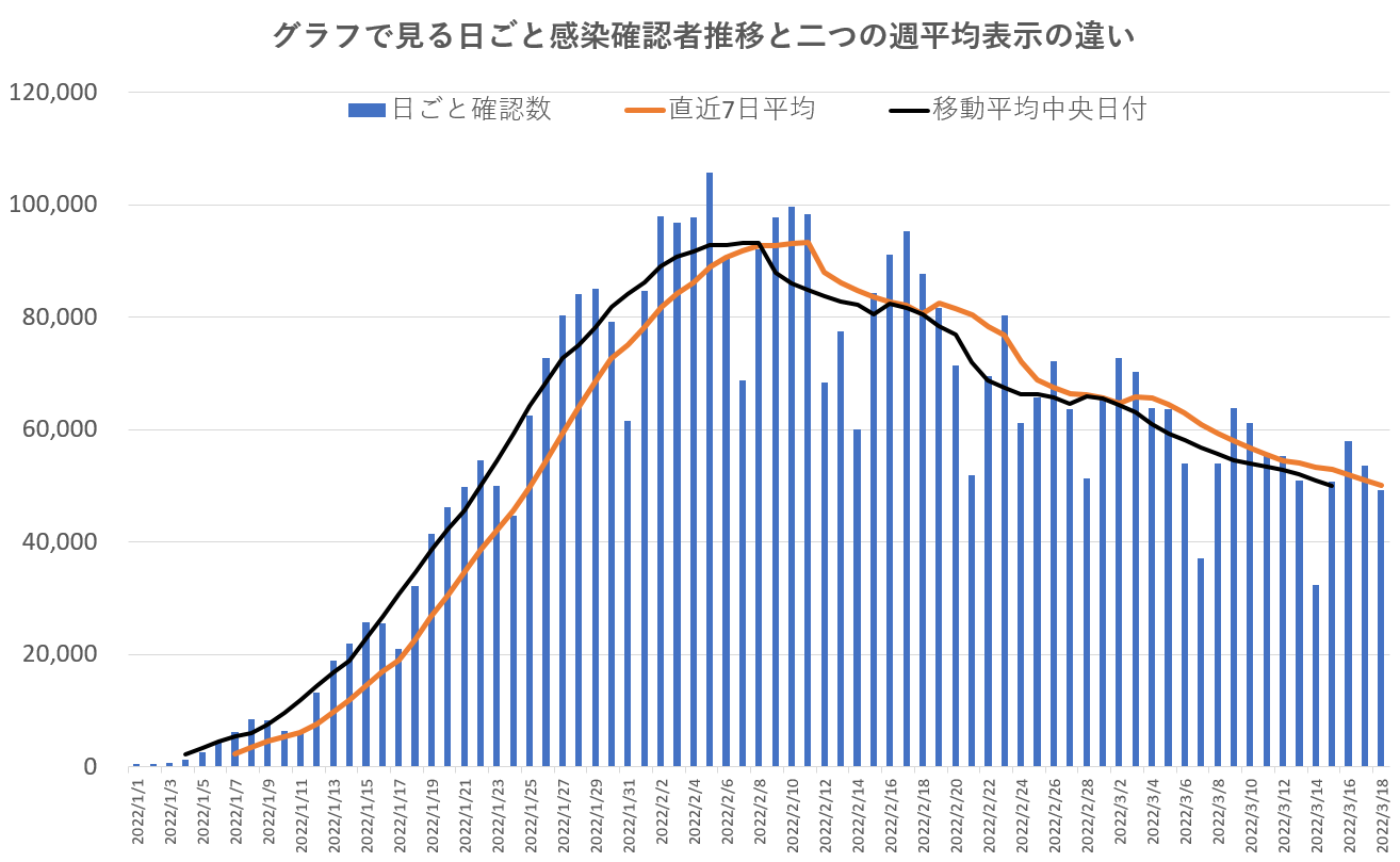 これで見ると、明らかに直近7日平均値を最終日で表した(オレンジ線)は間違いであることが分かる。平均期間の中央値で表した(黒色線)が時系列的に正しい表示方法であることが分かる。