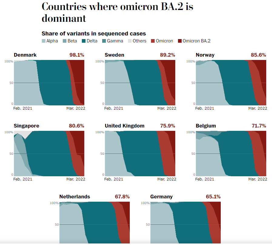 ワシントンポストが分析したコロナウイルス遺伝子配列のGISAID国際リポジトリに記録されているように、オミクロンのBA.2サブバリアントは、すでに世界で最も優勢なコロナウイルスの形態です。