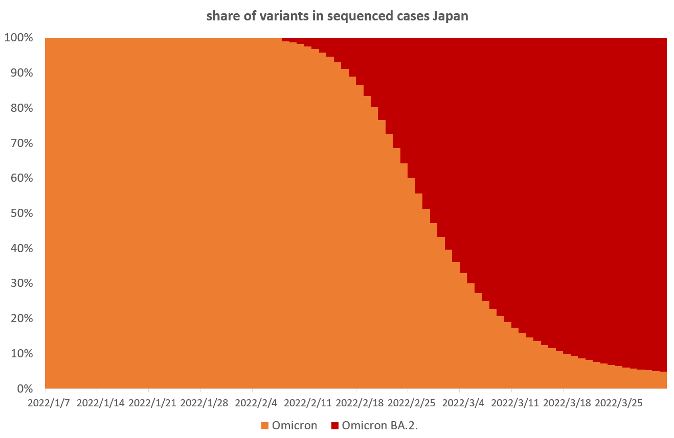 COVID-19 日本のオミクロンとその変異体BA.2の感染割合の推移