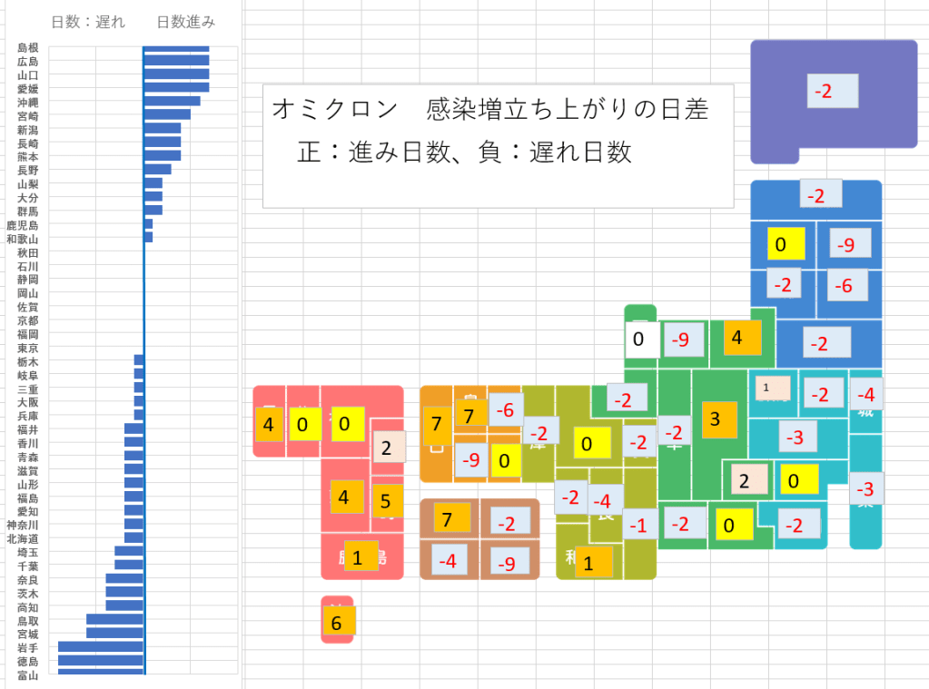 下の画像はその日数を各行政区毎に記入したものである。かなり乱れてはいるが、沖縄をはじめとする南西の地域の感染爆発が早く起こり、北海道、東北地域が遅れた傾向が見て取れる。