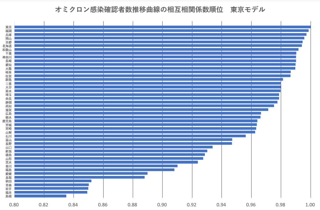 東京モデルに於ける2021年12月26日から2022年1月31日までの期間と各地域感染系列の相互相関係数を求めた。その中で最高相関係数が0.9までの地域数が85%であり日本全国ほぼ似かよった感染状況でああったと云えよう。