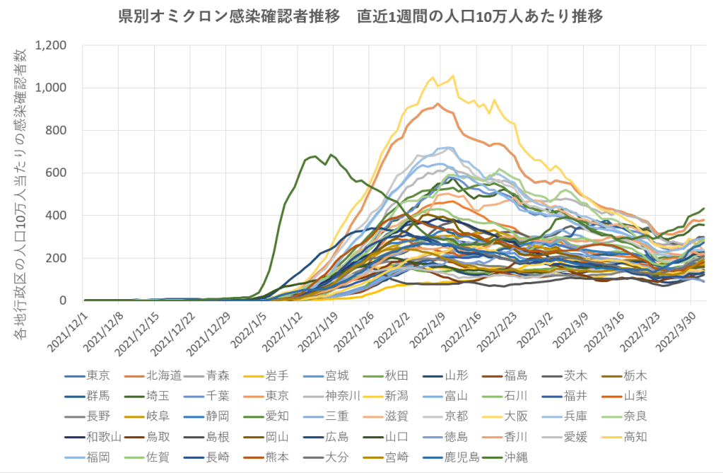 COVID-19 日本のオミクロン 地域別感染急上昇の立ち上がりに早い遅いが見られた
