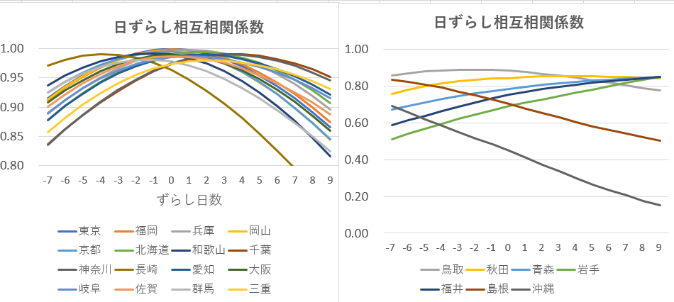 日ずらし移動相関係数の日差の様子を下のグラフに示す。相関係数の悪い7県の場合は右グラフの様であった。