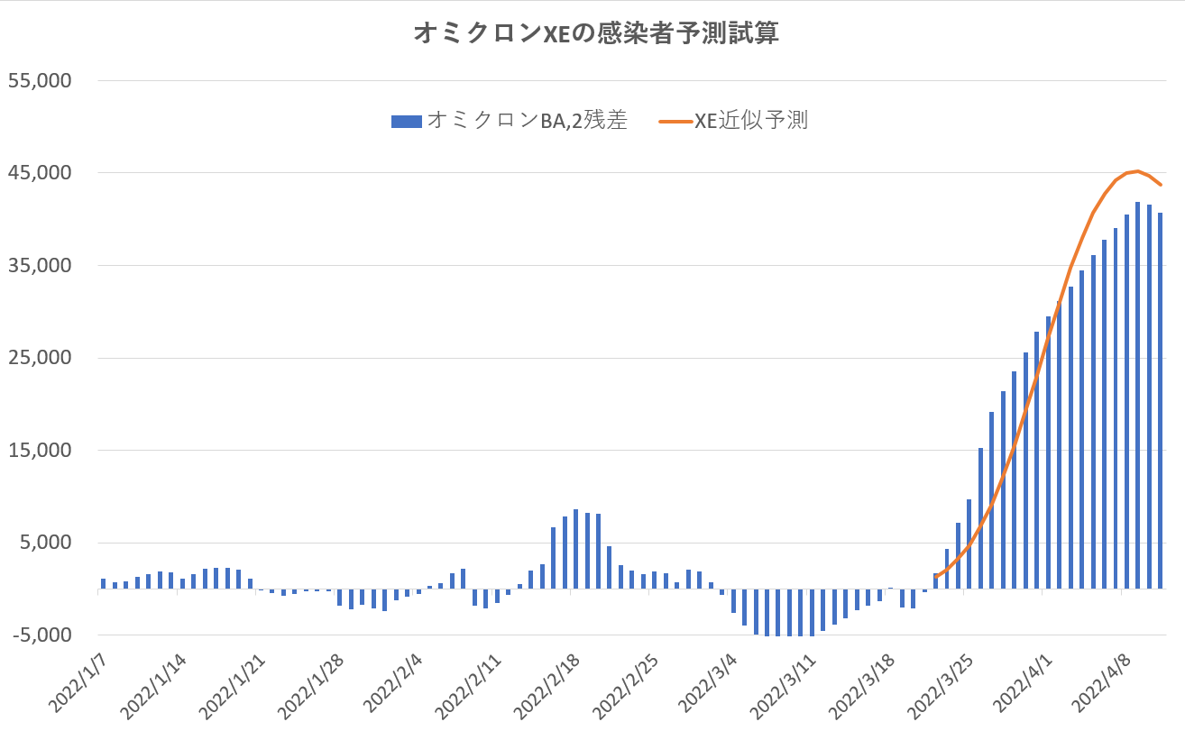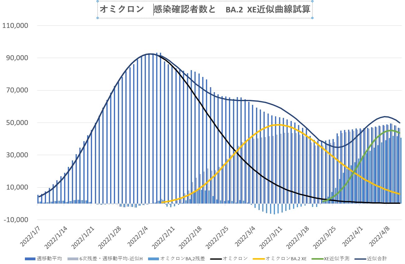 日本の集計感染確認者数から初期オミクロンとBA.2変異感染者数近似値を引いた残差をXE値仮定して。