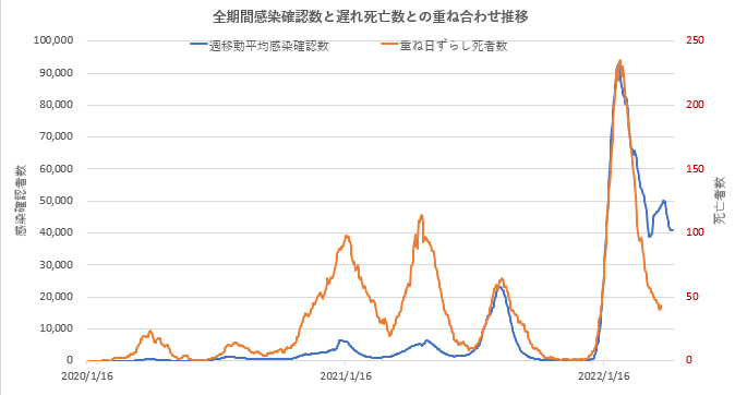 この死亡遅れ日差を進めて感染確認者数推移と重ねて描いたのが下のグラフである。