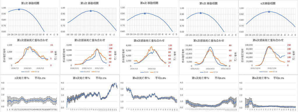 下の組みグラフは、第2次以降の感染変動期毎に死亡遅れ日数と死亡率推移、平均死亡率を示したものである。