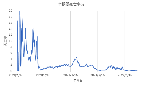 上のグラフの感染確認者の日ごと死亡率%は下のグラフの様で、COVID-19発生初期ではPCR検査や死亡確認が確定していないと見られる乱高下が見られるが、2021年7月ごろ以降は安定したデータが得られていることが分かる。