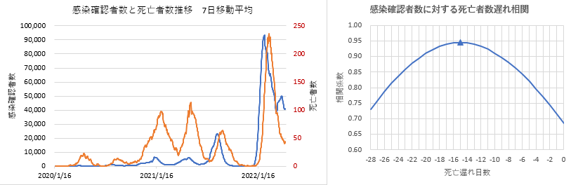 感染確認から死亡が発生する平均期間を求めるために両曲線の日ずらし相互相関を死亡遅れ日数に従って求めたものが右グラフである。最大相関係数の遅れ日数は15日、相関係数は0.95であった。