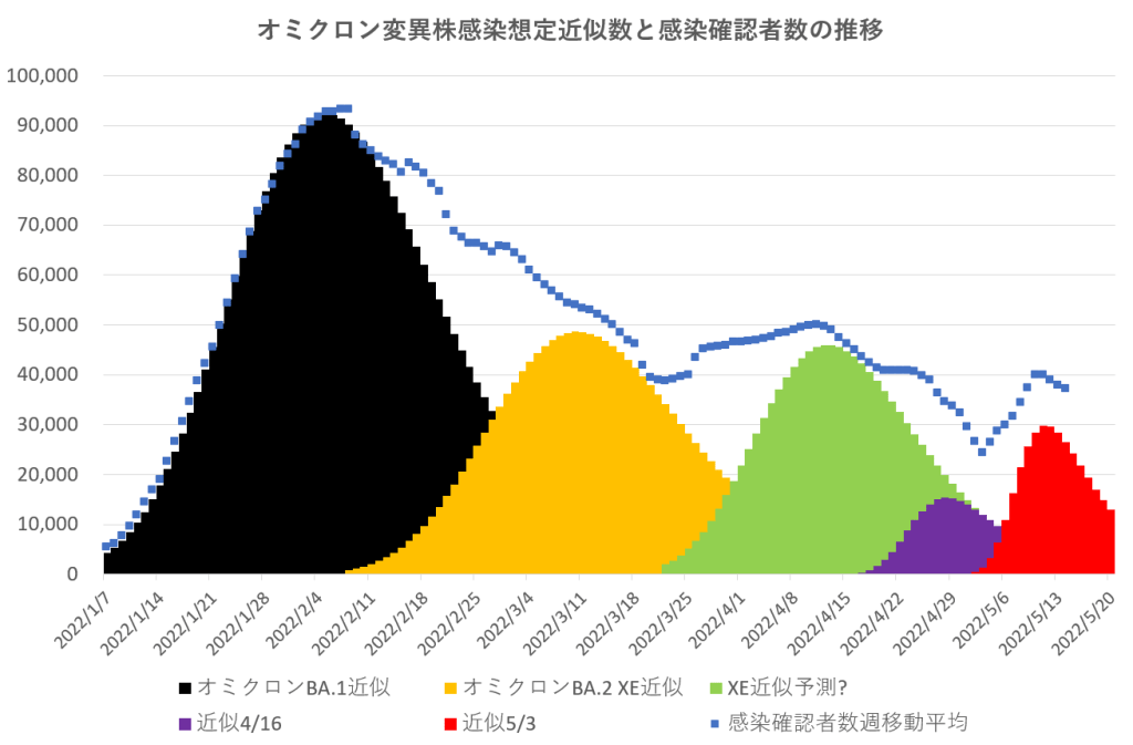 今まで書いてきたグラフの表示を変えて色分け画像で描いてみた。オミクロン感染が終息しないのは、次々と感染性異株が現れ感染者を増加させていると仮定した場合の試算である。各感染上昇期の実効再生産者率の指数関数近似値から推定した場合で、今までの計算式と同じ。
