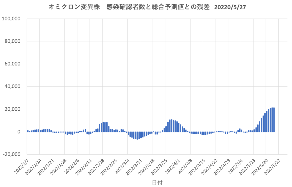 実勢感染確認者数から近似予測数を引いた残差。やっと頂上が見えてきた。