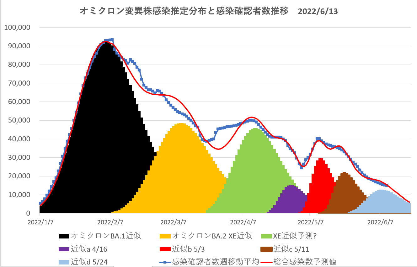 下のグラフは、私が連続して書いてきた感染株変異の数値当てはめによる感染推移の最新版である。
