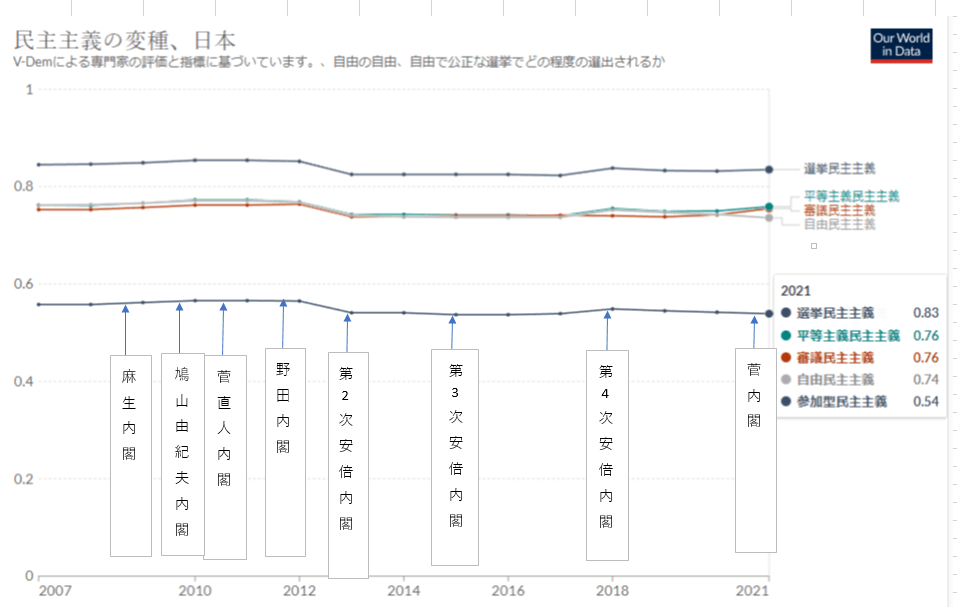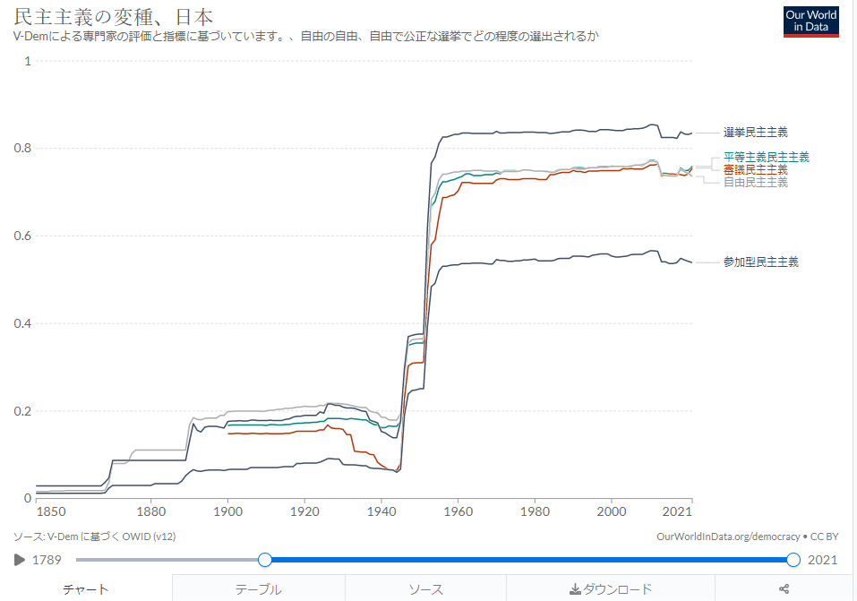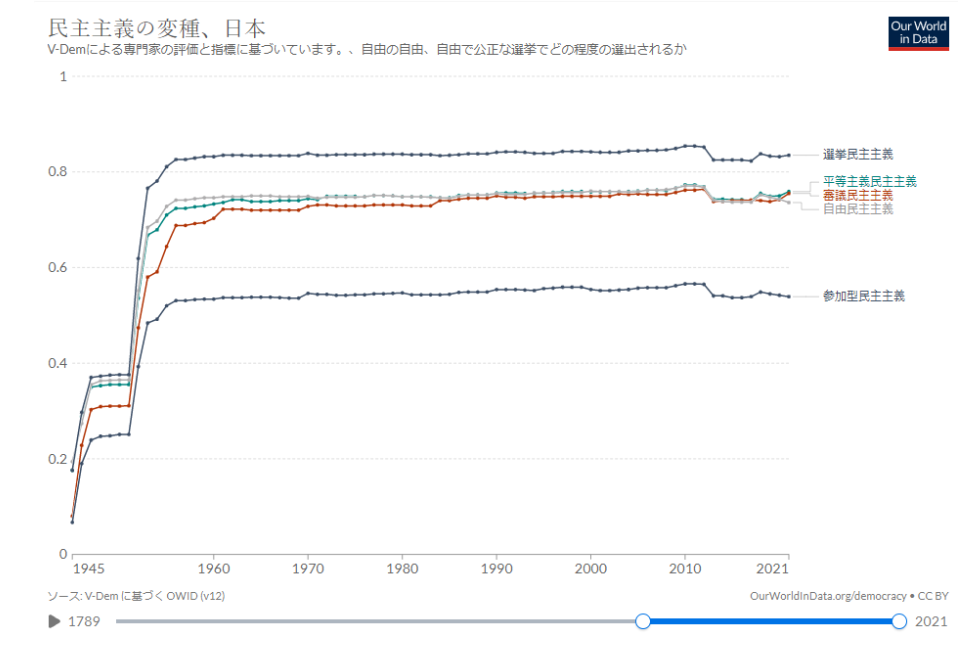 OWiDが最近発表した世界の民主主義変遷と日本の評価。
