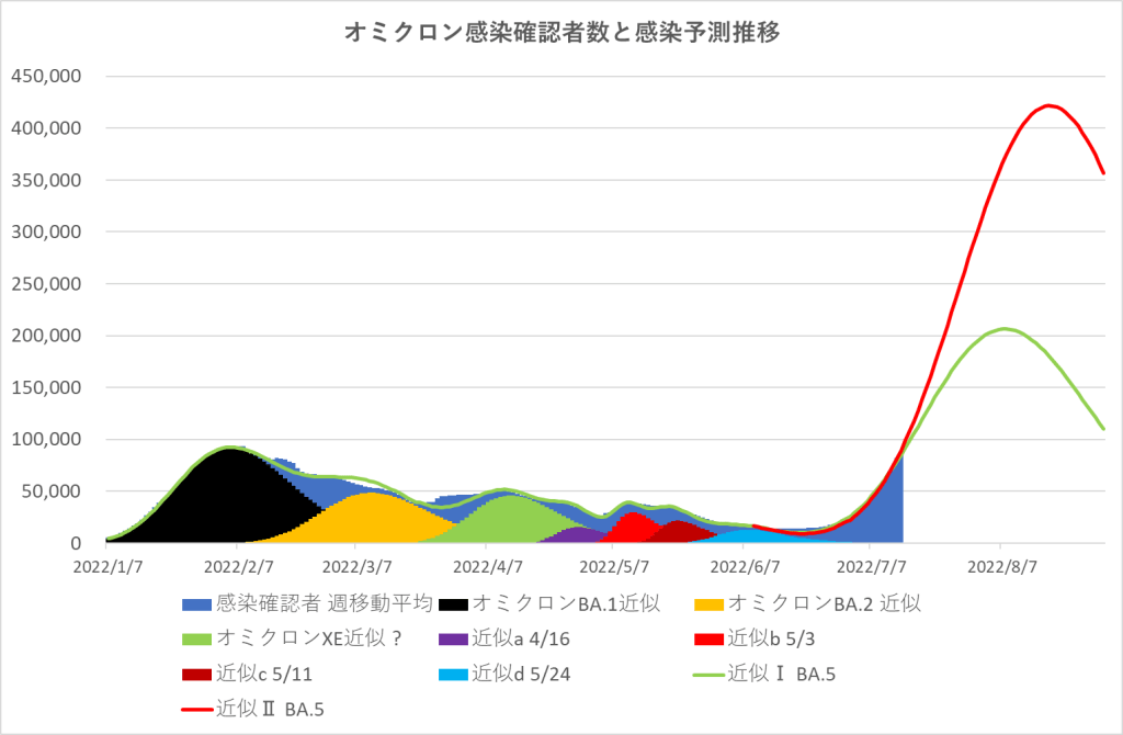 感染変異株の感染推移とBA.5と云われる今回の感染爆発予測の試算。