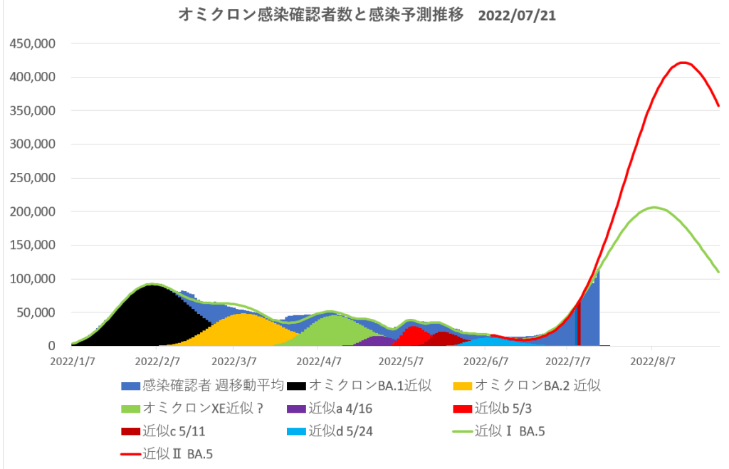 7/15日に投稿した「BA.5と云われる感染爆発の予測」から1週間。まだ修正の必要は無さそう。