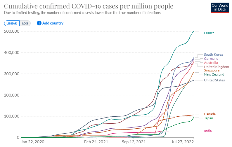 確かに日本が週平均の日ごと感染者確認数では急増し世界一位になったかに見える。