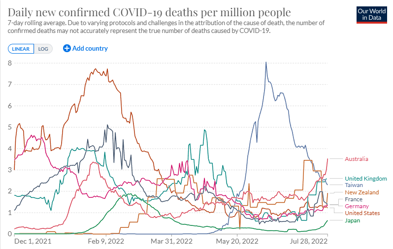 オミクロン感染以降の期間による死亡者の日ごとの死亡者数を見たものが下のグラフで、ここでは日本は最下位である。