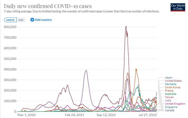 確かに日本が週平均の日ごと感染者確認数では急増し世界一位になったかに見える。