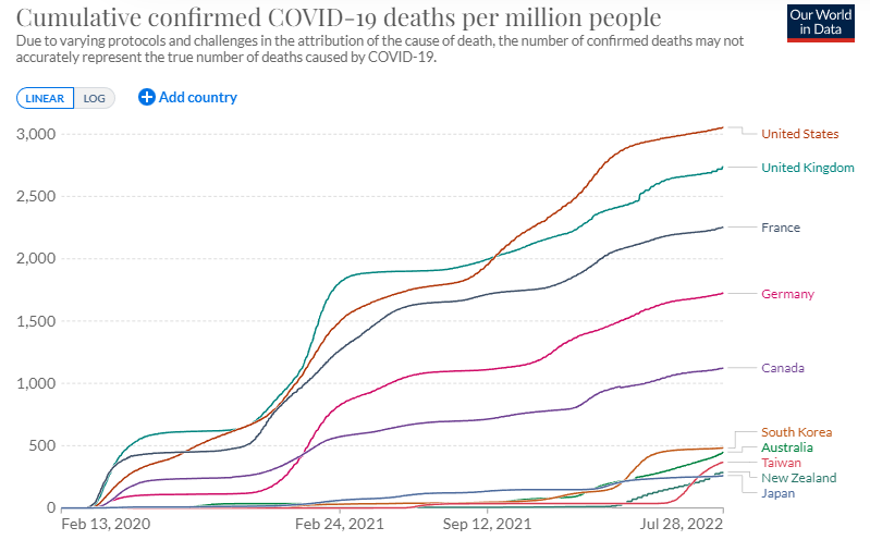 COVID-19発生からの累積死亡者の人口100万人当たりで見ても日本はニュージーランドとともに最下位である。