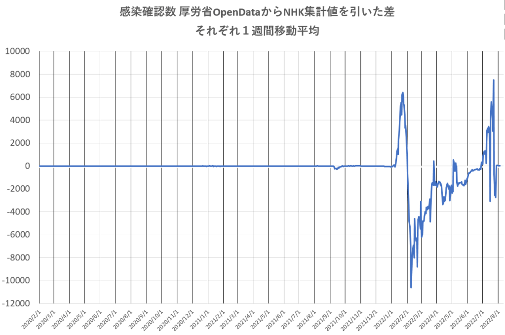 ここで、顕著に見られる結果として、OWiDが2021/11/1より2022/2/1までは厚労省のデータに追従しているように見えるがその他の全期間はNHKの集計値を採用している。