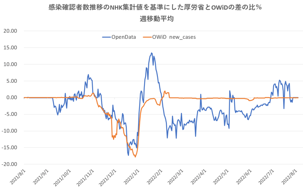 下のグラフは、違いが始まった2021年8月からの差をNHK集計値を基準にした比%で表したものである。ここでは世界的に流通しているビッグデータベースOWiDの日本データについも同様に比較した。