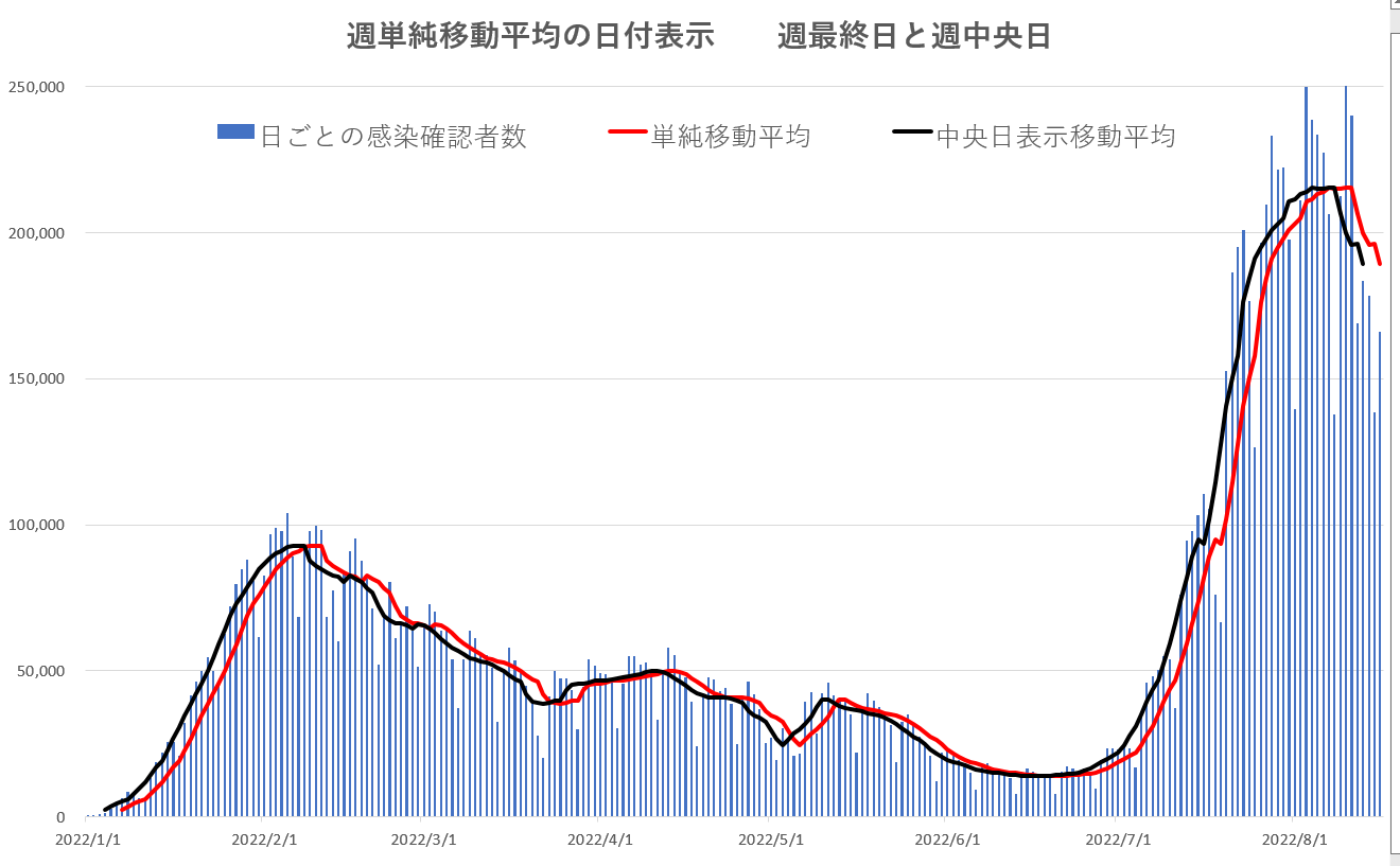 一般に、日ごと集計値の単純移動平均は、直近のn日のデータの最終値の平均値で表される。したがってその曲線は実際の動きより遅れて追随する。移動平均を用いて実際の動きを示すには平均の最終日ではなく平均期間の中央日(重心の日付)がその正当な情報表示日である。例えば1週間移動平均であれば平均の最終日から3日前の日付とするのが正当である。