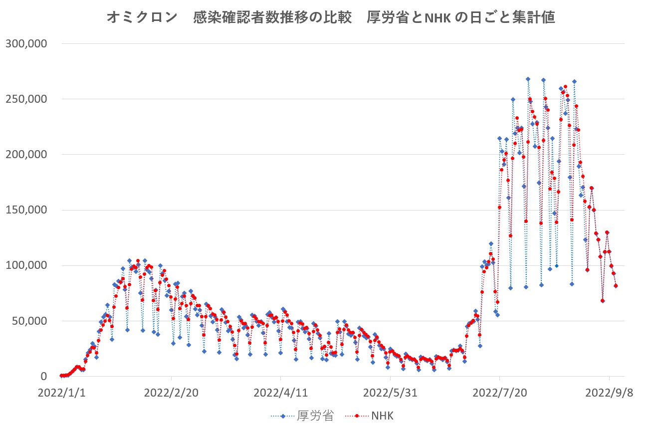 組みグラフ上の段で見るようにNHKとOWiDの間では殆ど差が無く(赤線)、これ等と厚労省違いが大きい。