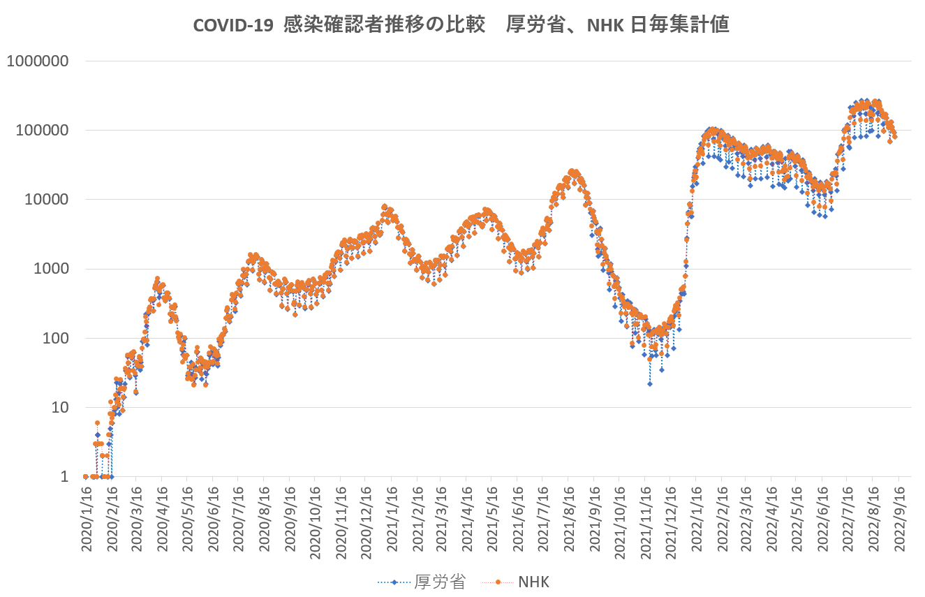 COVID-19 日本の日ごと感染確認データーベース 厚労省、NHK、OWiD の間ではこんなに違う