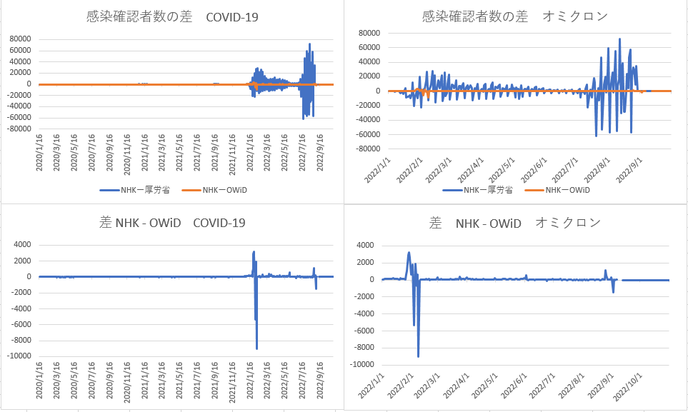 NHKとOWiDとの違いを見るためのグラフが下段で、殆ど差が無いが2022年1月オミクロン上昇初期で混乱が見られる。