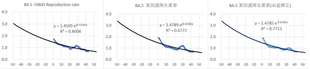 実効再生産率の計算には、BA.5単独感染者の推移が必要だが感染初期の混じりけの多い全体の感染者数では正確な値は検出できない。そこで、上のグラフの薄青背景の範囲で示すBA.5の感染者数が多くて優勢と見られる範囲の実効再生産者数(率)を用ることにした。これには三つの方式、OWiDのreproduction_rate、1週間の感染確認者数総計に対する次週の同総計の比を簡易実効再生産者数(率)とした場合、前者と同様だがお盆休暇集計漏れを補正した場合について行った。
