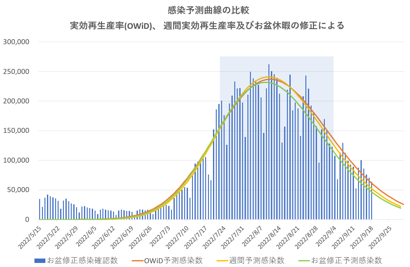 実効再生産率の計算には、BA.5単独感染者の推移が必要だが感染初期の混じりけの多い全体の感染者数では正確な値は検出できない。そこで、上のグラフの薄青背景の範囲で示すBA.5の感染者数が多くて優勢と見られる範囲の実効再生産者数(率)を用ることにした。これには三つの方式、OWiDのreproduction_rate、1週間の感染確認者数総計に対する次週の同総計の比を簡易実効再生産者数(率)とした場合、前者と同様だがお盆休暇集計漏れを補正した場合について行った。