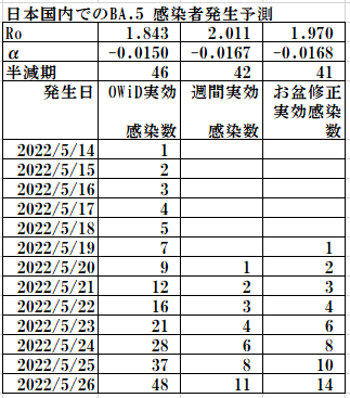 上記近似式から、感染者発生時の再生産数(率)Ro:これは、ウィルス自体の基本再生産数ではなく、日本における最初の一人の感染者が平均的社会生活で何人の新たな感染者を生むかの「社会的基本再生産数」とも云うべき実効再生産者数を求めた。それによると、最初の感染者は2022/5/14日から20日の間に現たと推定される。この様子を下表に示した。