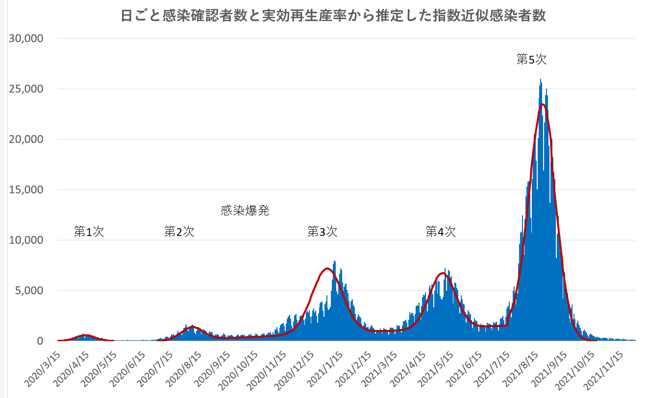 下のグラフは、現在までの日本の感染確認者数と、その時系列から求めた実行再生産者数の減衰率による指数近似感染曲線を重ねて示したものである。データはNHKの日ごと集計値を用いた。