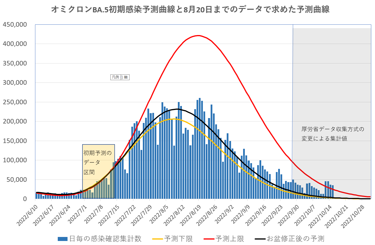 この結果を、偶然だと云われっればそれまでだが、実際の感染確認者数の推移は最低限界予測に近い変化を示したことが分かる。黒色の曲線はお盆長期休暇の影響を修正した8月21日にそのデータ系列で予測した推定予測曲線である。