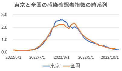 全国の集計値と東京の感染確認者指数を比べてみたのが下のグラフである。このように日本の感染拡大はほぼ全国同期して起こっていることが分かる。