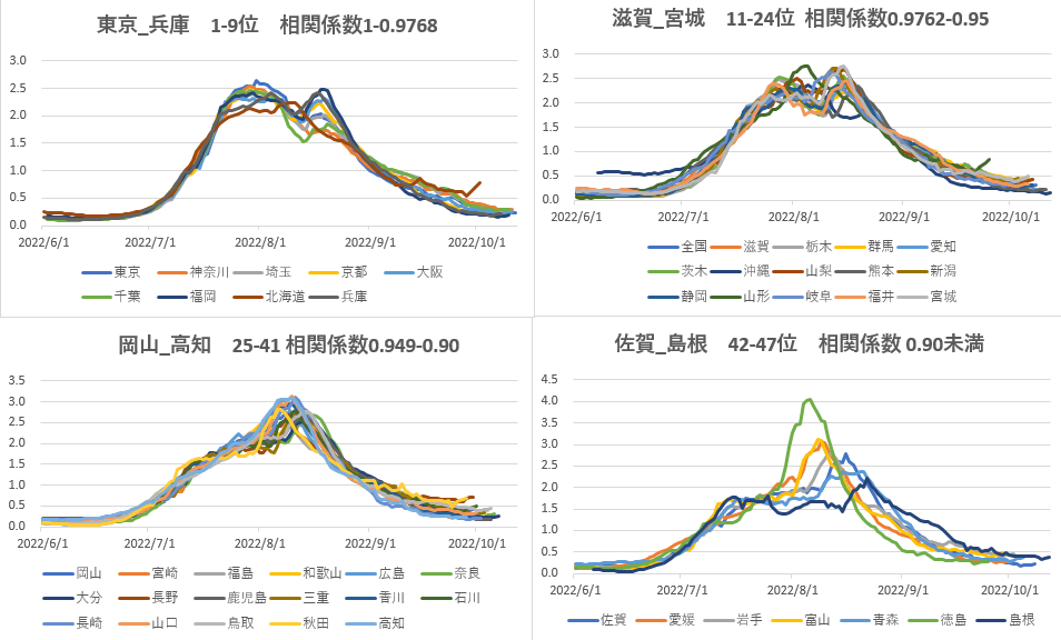 特長は、東京との相関が強い地域では7月後半から8月休暇前に感染が増加しているのに対し、相関が悪くなるにしたがい休暇後の感染確認者が増加していることである。