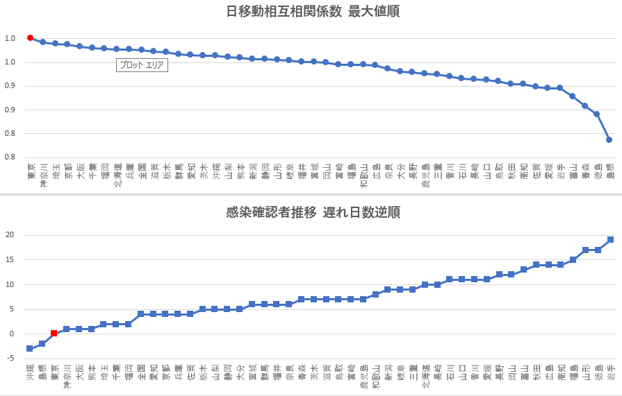 この表では、感染日が東京より早く発生したのは沖縄と島根の2地域だけであるが、島根については全国との相関係数が低く(0.8以下)確定的に云うことはできないかもしれない。