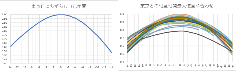 下のグラフ左は東京の日ずらし自己相関係数の日差との関係を表したもので、右は東京と各地域の相互相関係数の最大日を重ねて描いたものである。