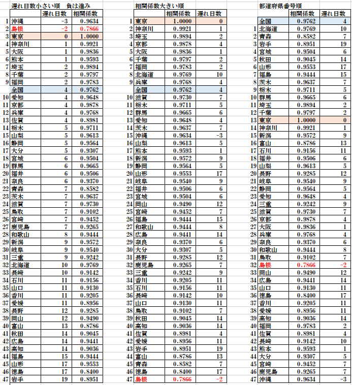 この表では、感染日が東京より早く発生したのは沖縄と島根の2地域だけであるが、島根については全国との相関係数が低く(0.8以下)確定的に云うことはできないかもしれない。