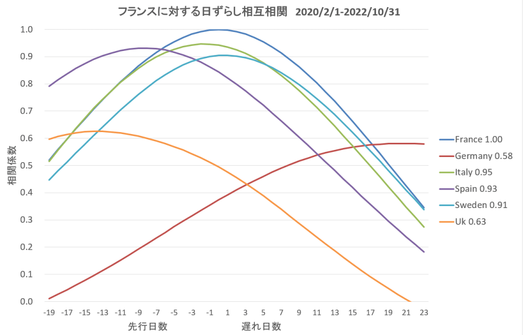 相関係数の最高値はイタリア、スペイン、スェーデンでは相関係数.0.9以上で似かよっているといえるが、イギリス、ドイツでは相関が0.6程度と無関係に見える。