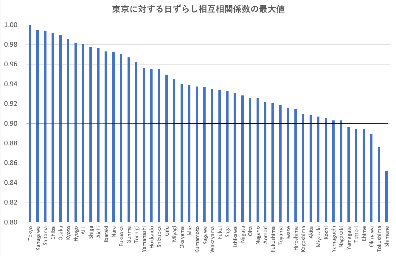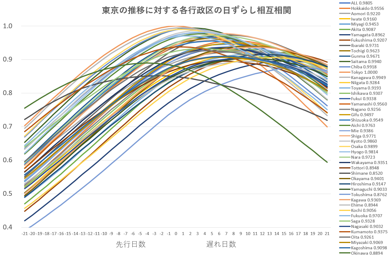 日本の場合は一部地方を除き、全国各地の相互相関最係数の再大値は0.9以上であり、感染状況は全国で一様に推移し均一性が見られる。