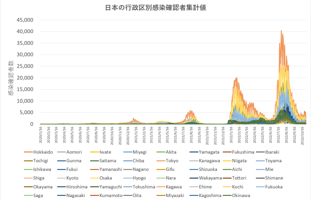 感染確認者数の全47行政区それぞれでの集計値を重ねたものが下のグラフである。全国ほぼ同期して感染が増減している様子が見られる。