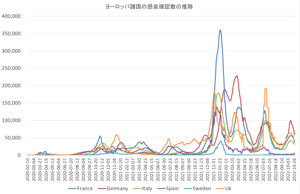 隣接する西ヨーロッパの国々、スェーデン、ドイツ、フランス、スペイン、イタリー、そして海を隔てたイギリスについてCOVID-19の感染確認数の時系列変化を比べてみた。