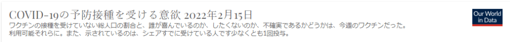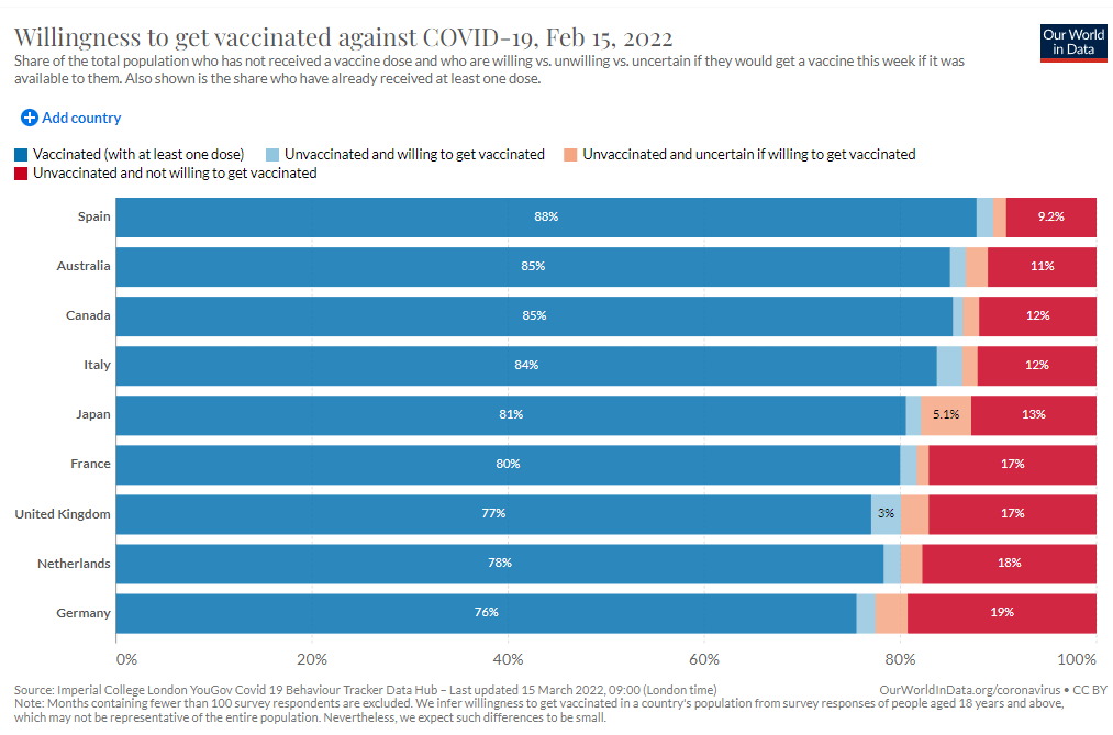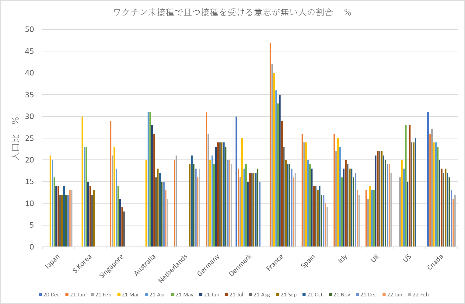 ワクチン未接種で且つ接種を受ける意志の無い人の割合。収録が始まった2020年12月から2022年2月までの各国別月毎の推移。