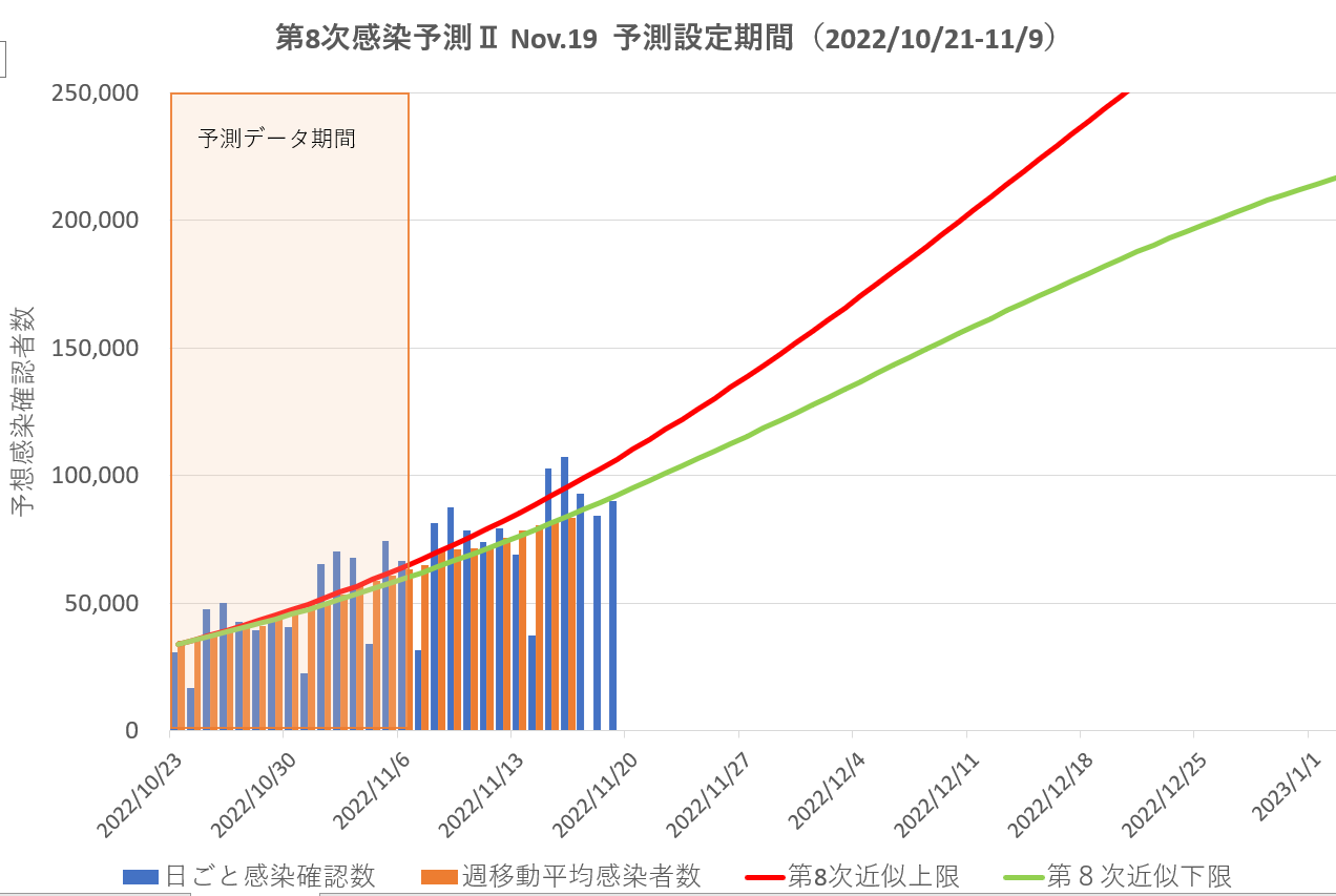 今のところ、感染確認者数の週(7日)移動平均は予測の下限曲線に沿って増加中。
