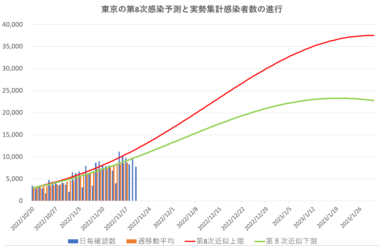 東京のデータによる私の感染予測と厚労省の東京実勢感染者数集計値の進行状況を比べることにした。