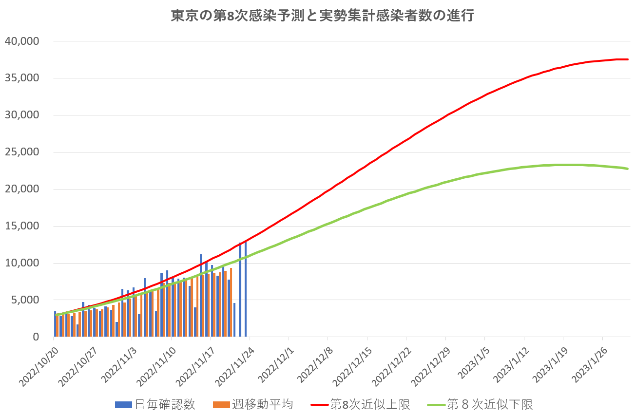 土日明けの集計確認者数増、強いて見れば東京の方が感染増の進み具合が低い様に見られ期待される。