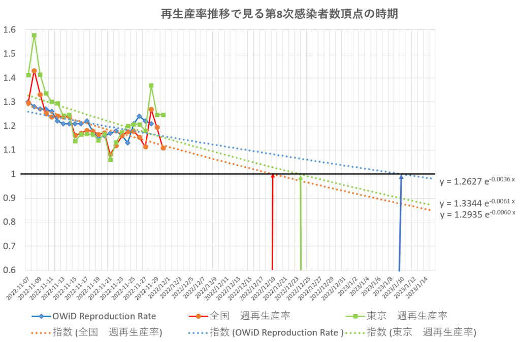 OWiDが算出した再生産者率と、厚労省のデータから算出した全国と東京の再生産率から指数近似した場合の感染者最大次期。