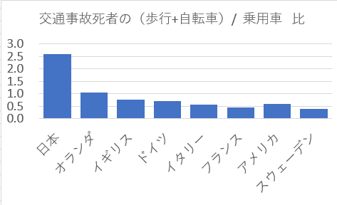 乗用車乗車中に比べ飛行+自転車の事故死亡比をグラフで見る。日本だけが2.5倍も多いことが分かる。