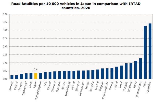 しかし日本の自動車当たりの事故死亡事故率は統計報告数のある先進国で少ない方から6番目。決して日本の運転者が悪いとは言えない。
