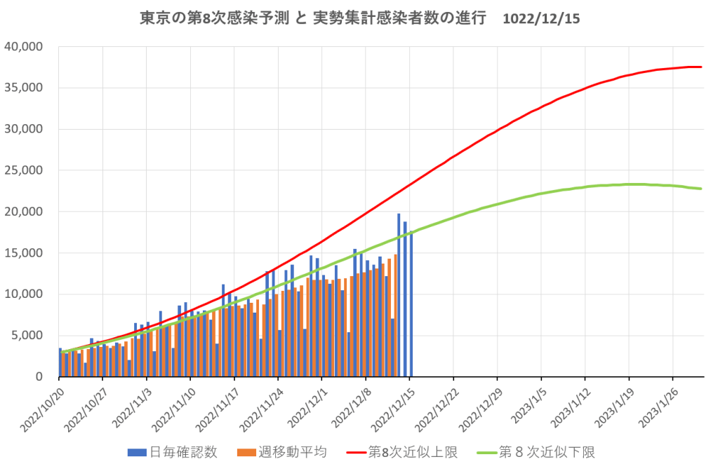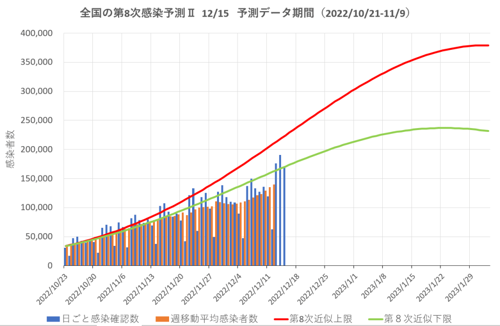 今のところ、感染者確認数の集計値は11月9にまでのデータで建てた予測曲線の下限に沿って進んでいるが?